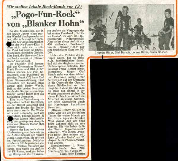 BLANKER HOHN kommen aus Hamburgs ungeliebtem Südstadtteil Harburg. Wir sind seit unserem unerwarteten Wiederauftauchen im April 2018 nicht totzukriegen. Mit der Beharrlichkeit eines regelmäßig aus dem Altersheim weglaufenden Rentners machen wir heute da weiter, wo wir 1983 – als der Bundeskanzeler noch Helmut Kohl hieß – begonnen hat: „Pogo-Fun-Rock”, wie die Harburger Anzeigen und Nachrichten einst messerscharf analysierten (was für Narren :-)).